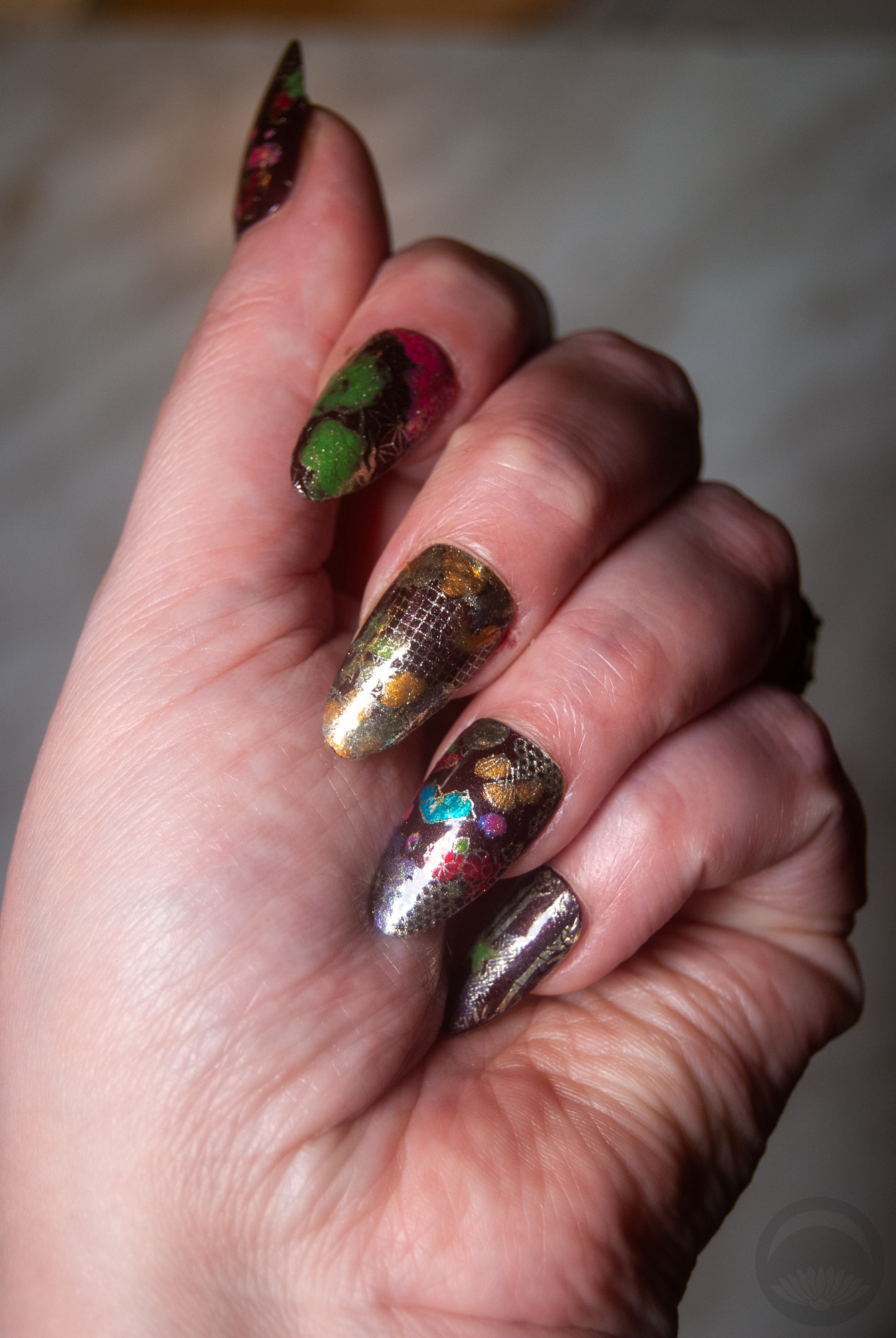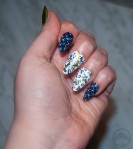 I did standard straight-to-nail stamping for the sashiko manicure, and made my own transfers for the yuzen-style one. If you’re curious I did make a little video of the process for the transfers, but there are plenty of incredible videos out there that explain how to use stamping plates far better than I could. I would suggest starting with Maniology’s own YouTube page, they have tons of clear and helpful videos.