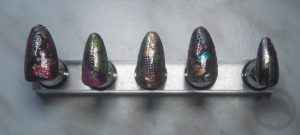 Where possible, I have linked to the polishes I used. However, I’ve been hoarding collecting nail polish nearly as long as I’ve been hoarding collecting kimono so many of these colours are no longer available. In one case the brand doesn’t even exist anymore! I do recommend getting a good white polish if you plan to use it for stamping, especially over dark colours, but the selection for the yuzen-style manicure has a ton of room for interpretation.