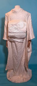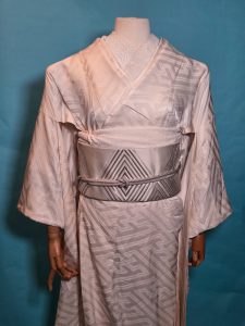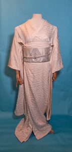 There really was only one choice for April’s birthstone – this shiromuku with sayagata pattern that looks like facets, and a white obi with silver hishi (diamond) designs. Add in a textured white and silver haneri and a white beaded obijime, and I honestly don’t know how I could have evoked diamond better without gluing crystals onto the ensemble. Which is not something I was keen to do on a wedding piece, frankly.