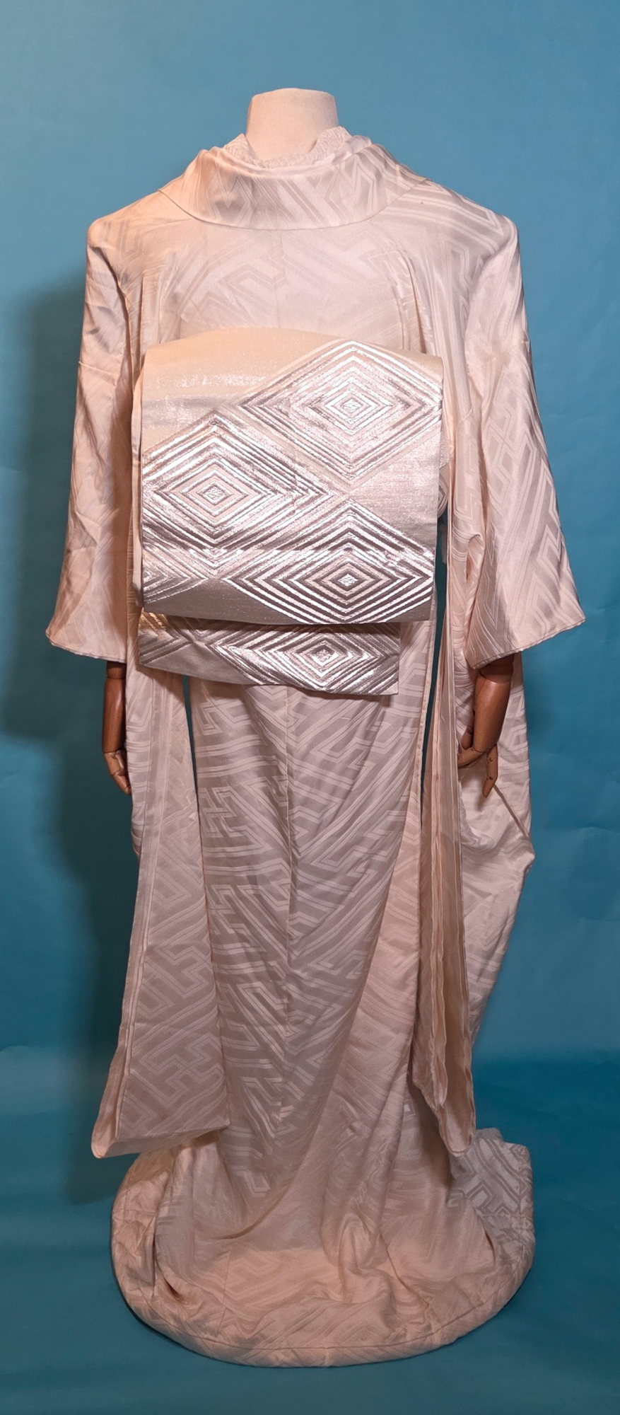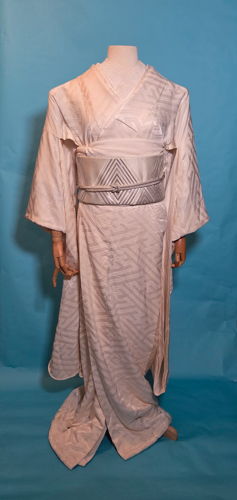 My only real wish was that the kimono and obi were both in the same undertone family. It’s not entirely evident here due to the blue background, but the kimono is more of a warm ivory white and the obi is a cool greyish white. But eh, lets pretend that’s to evoke light refraction or the colour variation you can find in natural diamonds.